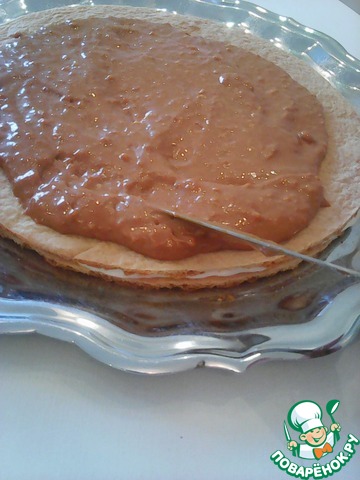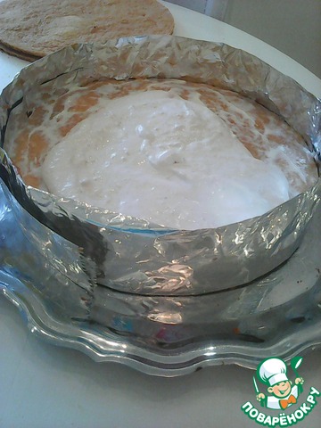 • 3-й корж немного смазываем сметанным кремом (немного оставить на еще один корж), теперь нам понадобиться форма, у меня такой нет, поэтому сделала из фольги и закрепила скотчем (так даже удобней), дальше выкладываем творожную начинку и ровно распределяем по поверхности. 4-й корж смазываем кремом со сгущенки и накрываем последним. Отправляем наш торт в морозильную камеру на 30 мин. Сделать сметанное желе - растворить желатин в 100 мл кипятка, охладить и добавить к сметане, размешать и залить им торт. Снова отправить в холодильник на 10 мин.