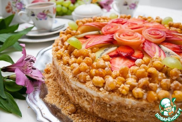 • Когда желе на торте застынет можно смело доставать его из холодильника и украшать. Остатки коржа и орехи измельчить в крошку и обильно посыпать ею бока торта. Дальше украшение зависит только от вашего воображения, фантазий и желания. Центр я украсила фруктами, а по бокам насыпала сладкий нут. Получилось красиво, нут очень похож на лесные орехи и не менее вкусный!) Украсив торт снова отправить в холодильник и дать пропитаться хотя бы 2 часа.