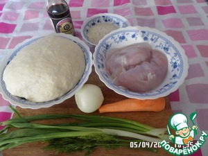 На рабочей поверхности раскатываем из теста 10 лепешек. Выкладываем на них слоями - рис, куриное филе с овощами, зелень.