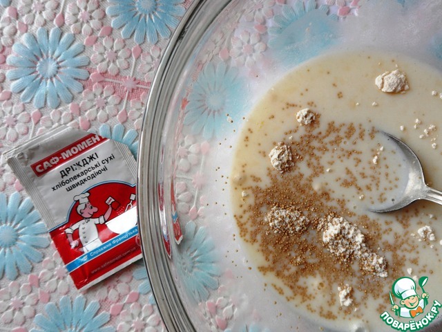 Все продукты должны быть комнатной температуры. В теплое молоко добавить 1 ст ложку сахара, 1 ст ложку муки и дрожжи. Я использую дрожжи Саф момент. Оставляем в теплом месте на 15-20 минут до образования "шапочки"