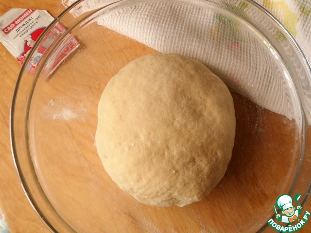 Сформированное изделие ставим в теплое место минут на 30. Вот как оно у меня увеличилось. Смазываем взбитым яйцом ( я использовала только желток). Ставим выпекаться в духовку при температуре 200 град. до готовности. Время выпечки зависит от вашей духовки.
