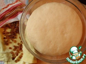 Пока тесто "дозревает", заливаем изюм горячей водой на 10 мин, сливаем воду, подсушиваем на полотенечке. После расстойки, поднявшееся тесто ещё раз обминаем, добавив уже изюм.