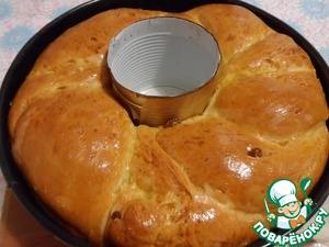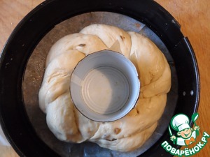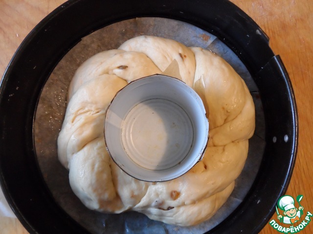 Разделяем тесто на 2 части, раскатываем колбаски, которые скручиваем в жгут. Можно разделить на 3 и сплести косу. Делаем круг и соединяем концы. Для того, чтобы изделие была правильной круглой формы я выложила его в разъёмную форму, застеленную пергаментом. Для того, чтобы в середине осталось отверстие, вставила жестяную банку от кукурузы, в которой выпекаю куличи. что хорошо может получиться в форме для кекса с трубой.