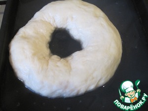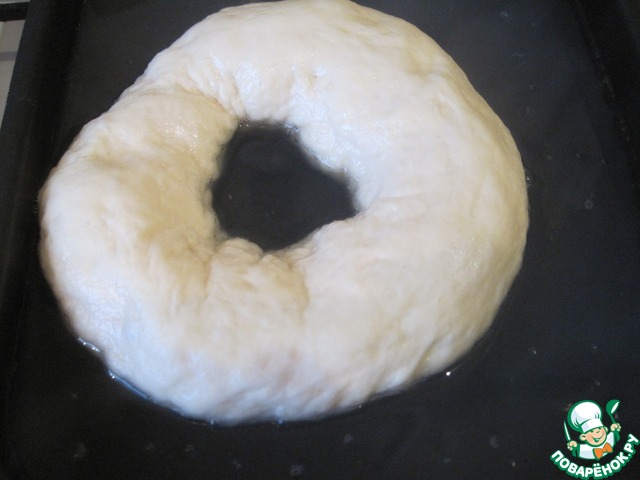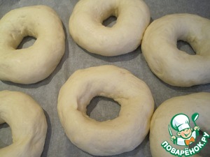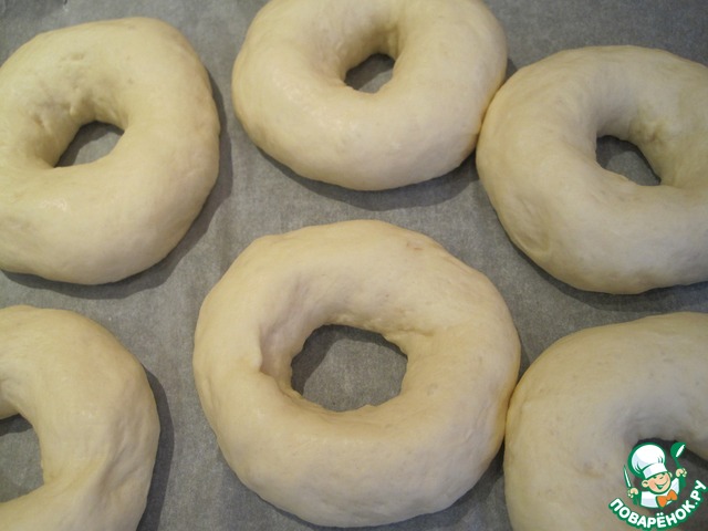 Далее в каждом шарике сделаем сквозную дырку, немного растянем и снова укроем и дадим отдохнуть ( 15-ть минут). Затем растянем бублики до желаемого размера, накроем и оставим в тёплом месте на полтора часа для расстойки.