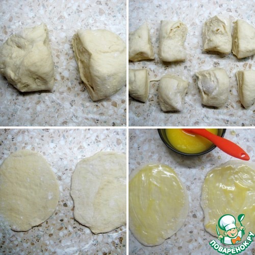 Раскатайте из каждого кусочка блинчики и смажьте их растопленным сливочным маслом. -