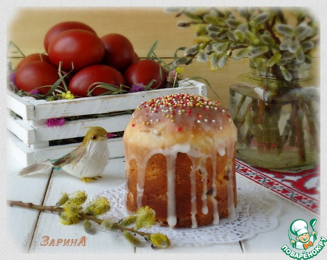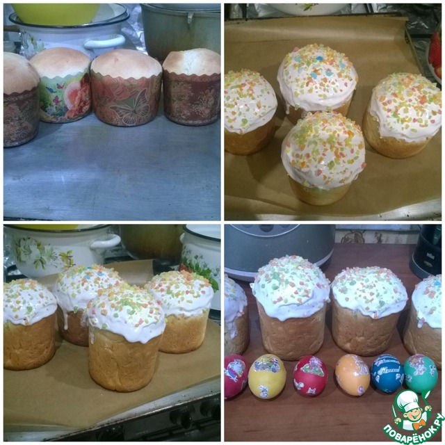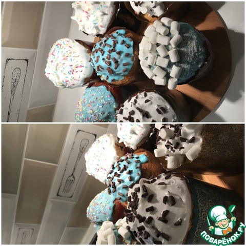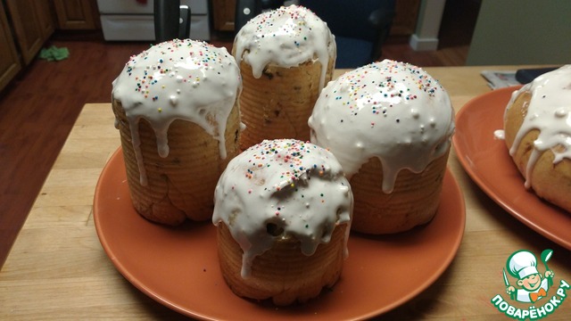 Для глазури смешать сахарную пудру с водой, хорошо растереть. Покрыть глазурью еще горячие куличи. Приятного!!