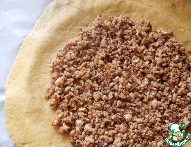 Берем большую часть раскатываем в круг диаметром на 2-3, см больше чем наш пирог (примерно 30-32см), кладем пласт на пергамент для выпечки, в цент выкладываем половину начинки. Оставляя примерно 2-3см свободными. Затем раскатываем маленькую часть размером таким чтобы только закрыть начинку. Выкладываем на пирог и кладем оставшуюся начинку.
