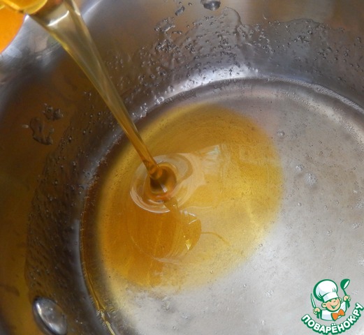 За 10 минут до готовности пирога начинаем делать сироп, в сотейнике смешиваем сахар и лимонный сок. Ставим на небольшой огонь и нагреваем пока весь сахар не растворится, снимаем с огня, даем пузырькам осесть и вливаем мед. Хорошо перемешиваем.