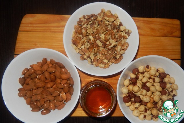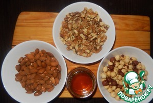 Начнем с начинки. Подготовим орехи и необходимый мед.