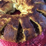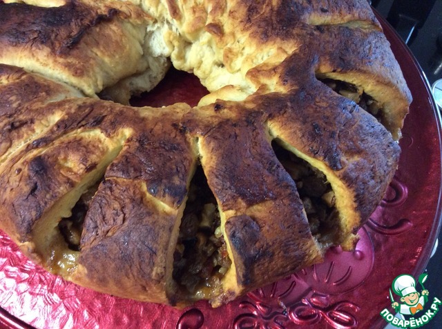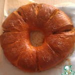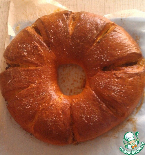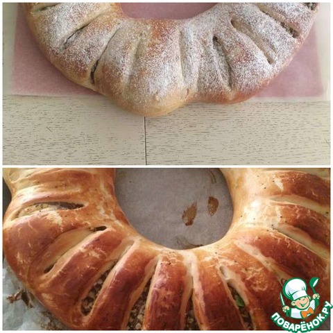 На кольце делаем надрезы примерно через 2-3 см, не прорезая до конца. Смазываем взбитым желтком и ставим в разогретую до 200 градусов духовку на на 15 минут, затем убавляем температуру до 180 гр. и выпекаем еще 15-20 минут.