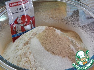В посуде перемешиваем 450г муки, 4 ст. л. сахара, соль и дрожжи.