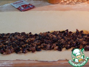 Раскатываем его на доске. Отступив от края выкладываем начинку. Заворачиваем в рулет.
