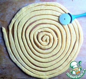 Обминаем его и раскатываем в круг, толщиной около 7-10 мм. Разрезаем по спирали, чтобы получился длинный жгут.