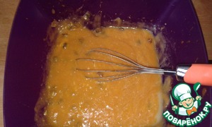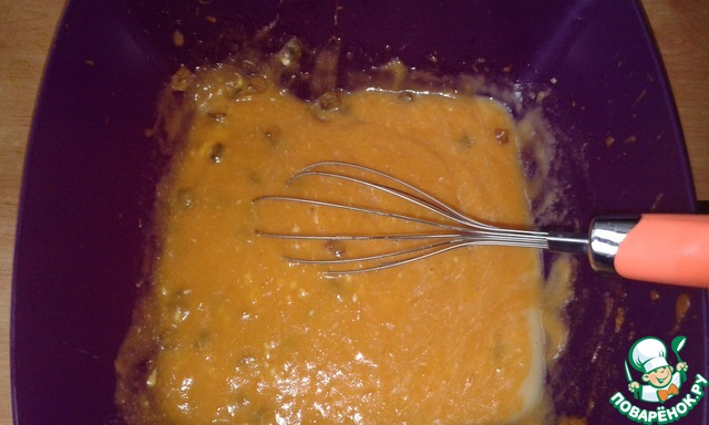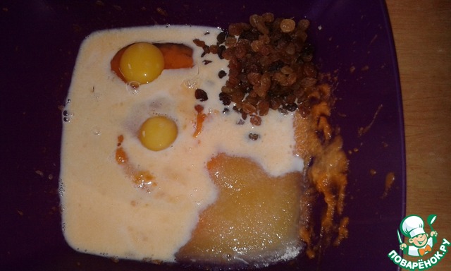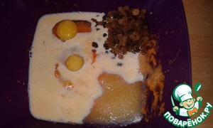 Измельчить с помощью блендера в пюре. Добавить яйца, сахар, мягкое сливочное масло, сливки, изюм