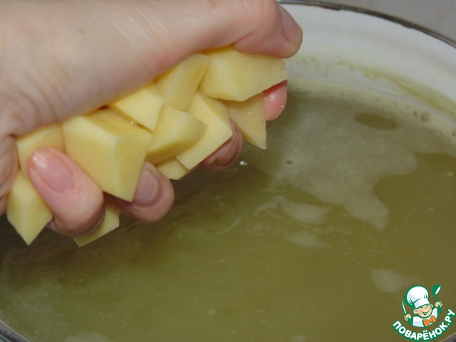 Когда горох начнёт развариваться, посолить и выложить почищенный и нарезанный картофель.