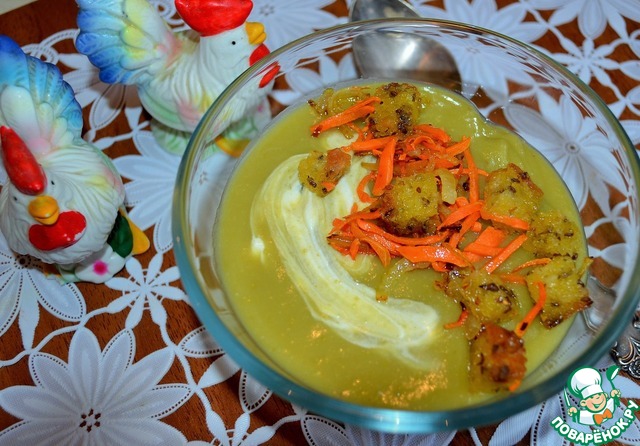 Из зеленого гороха получается очень нежный, вкусный суп. Я сделала большую кастрюлю супа-пюре. К постному варианты приготовила хрустящие сухарики. А для непостного - отдельно нарезала копченую куриную грудку. Оба варианта оказались очень вкусными.