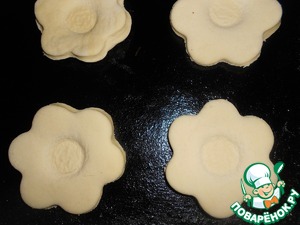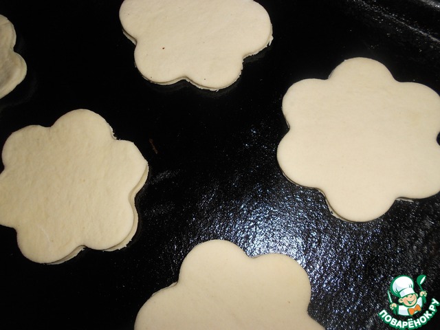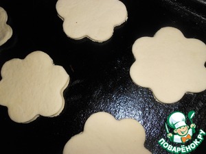 Тесто раскатать и формочкой вырезать цветочки. Выложить цветочки на смазанный маслом противень.