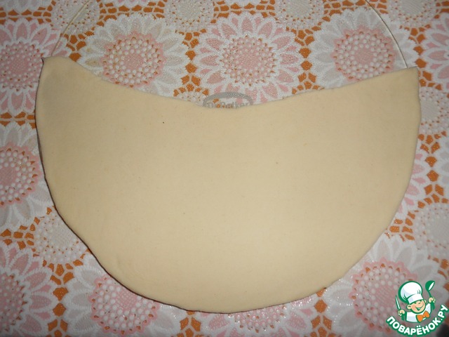 Тесто раскатать в круг, выложить в разъемную форму (у меня 26 см в диаметре), часть теста отрезать и оставить в виде основания корзины (см. фото).
