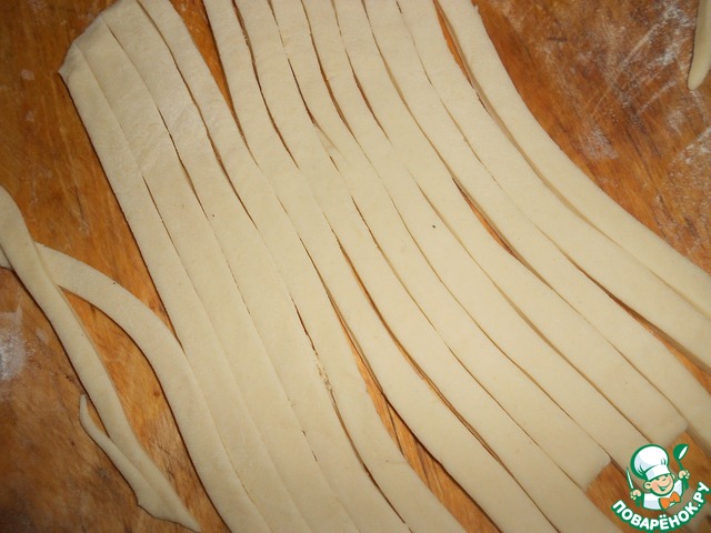 Остальное тесто раскатать и вырезать тонкие полоски (0,8 мм) для плетения корзины.