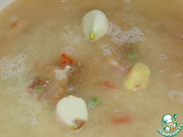 На овощи с мясом выложить промытый рис и залить водой так, чтобы вода покрывала рис примерно на 1-1,5 см. В рис воткнуть очищенные зубчики чеснока и кусочек имбиря. Закрыть крышкой и готовить на небольшом огне, пока вся вода не впитается. Перемешать, выключить газ и оставить под крышкой на несколько минут.