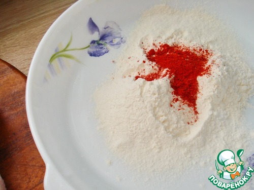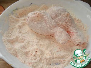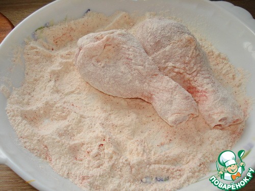 Обваляйте куриные ножки в смеси муки, соли и паприки.