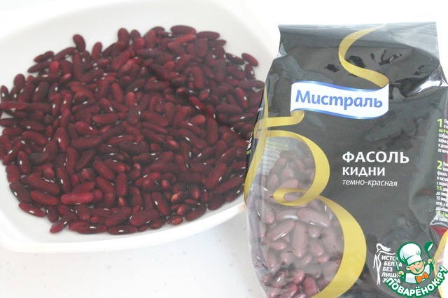Фасоль заливаем холодной водой и оставляем минимум на 4 часа, лучше сделать это на ночь. Фасоль используем ТМ "Мистраль" Кидни (темно - красная).