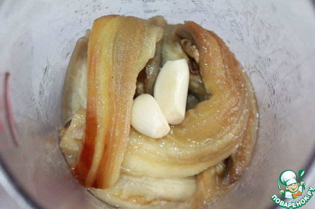 Мякоть баклажан выкладываем в чашу блендера. Туда же добавляем оливковое масло, лимонный сок и чеснок. Пюрируем. При этом баклажаны должны быть теплые, так мусс получается воздушнее.