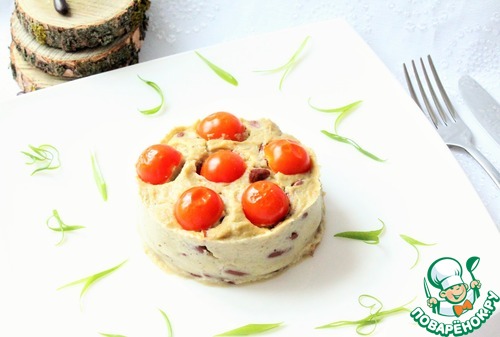 В металлическое кольцо выкладываем мусс. Сверху порезанные пополам помидоры Черри. Запекаем при 190 гр. в течение 15 мин. Даем немного остыть, снимаем кольцо и подаем.