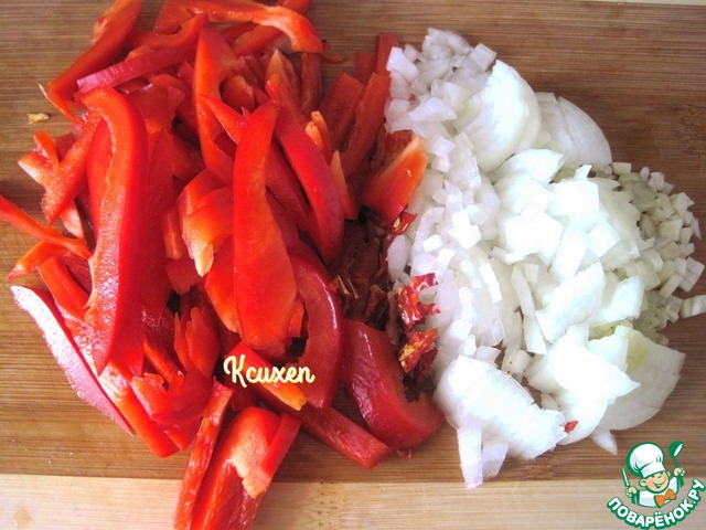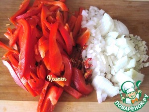 Лук, чеснок и перец чили мелко нарежем, болгарский перец нарежем полосками.