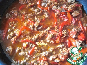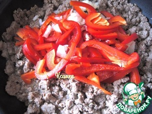 Фарш приправим зирой и перцем, посолим. Добавим овощи, и обжарим всё вместе несколько минут.
