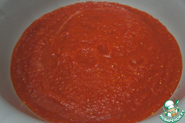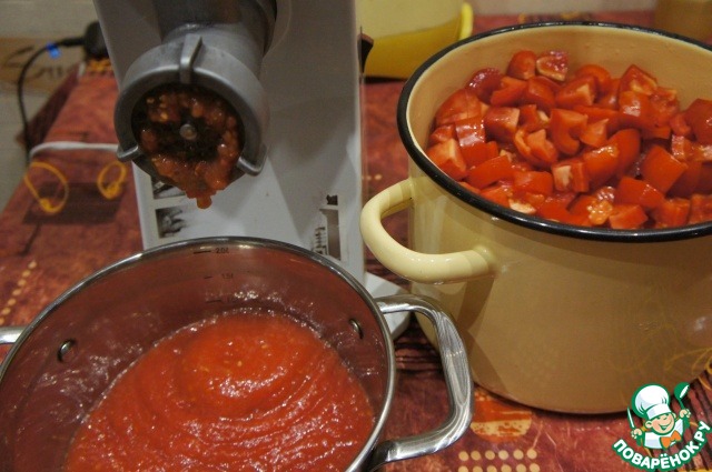 Для приготовления заготовки потребуется 3 л томатного сока. Его можно взять готовый, но хорошего качества, можно развести водой хорошую томатную пасту, а можно приготовить из спелых помидоров. Для этого помидоры нарезать, пропустить через мясорубку, а дальше через дуршлаг, чтобы отделить семена, если они вас смущают. Если не смущают, можно сквозь дуршлаг не пропускать.