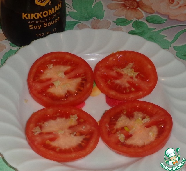 • Помидор помыть водой. Разрезать на кружочки. Чеснок натереть на мелкой терке и разложить его по кружочкам помидоров.
