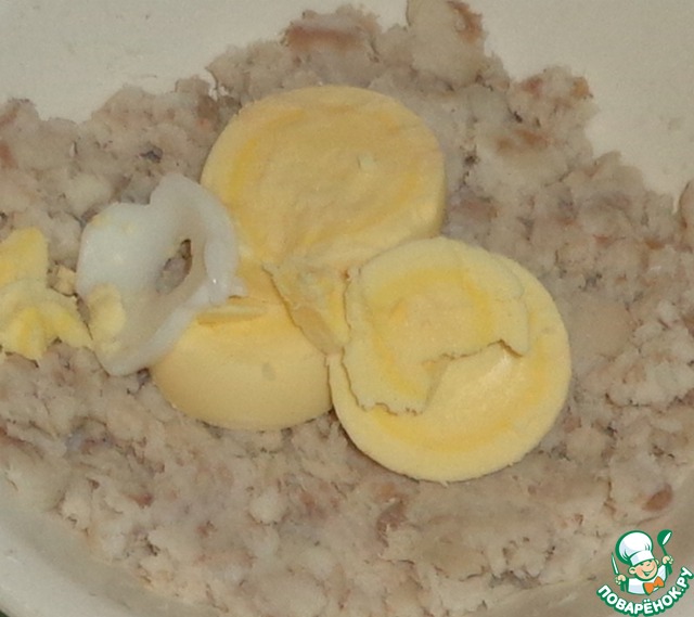 • Отварное яйцо порезать на кружочки. Аккуратно убрать желток. Кольца из белка кладем на помидоры.