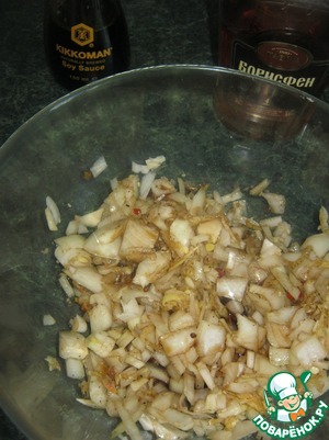 • В коньяк добавляем имбирь, сахар, чеснок, перец, приправы.