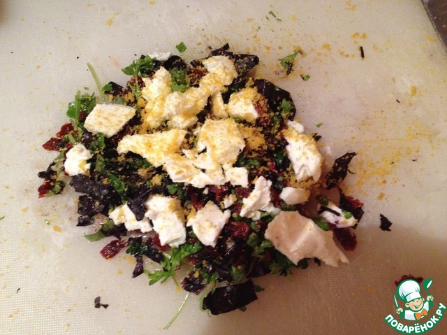 Сверху раскрошить фету, мелко натереть цедру лимона и снова перемешать.
