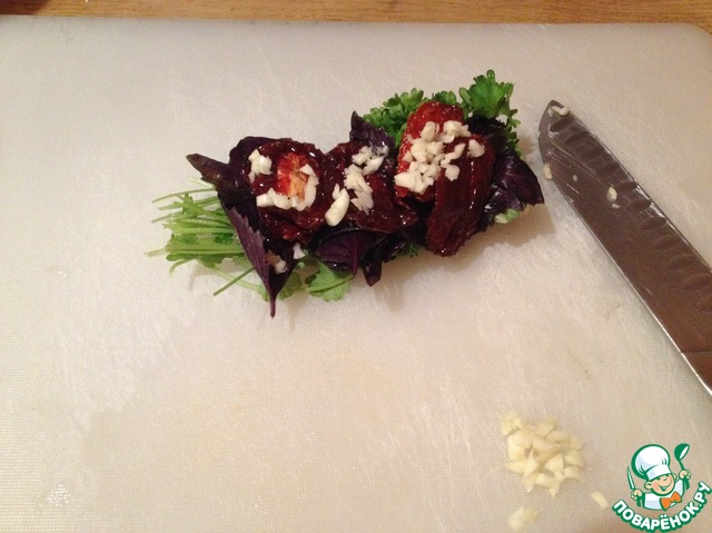 Выложить горкой на доске петрушку, базилик и вяленые помидоры с небольшим количеством масла. Добавить щепотку перца и раздавленные зубчики чеснока и мелко порубить все вместе, затем перемешать ножом. -