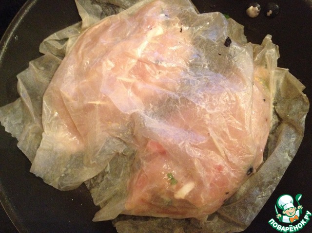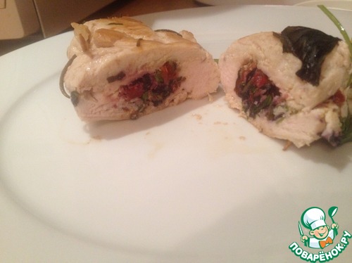 Оторвать кусок бумаги для выпечки и выложить на нее куриные грудки кожей вниз. маленьким ножом аккуратно сделать в каждой грудке прорезь, так чтобы ее можно было раскрыть. Наполнить разрез начинкой, утрамбовать её и "закрыть" филе.
