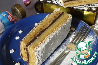 Каждый пласт пропитать сиропом. Нижний пласт промазать мармеладом. Сверху положить пропитанный сиропом второй пласт и прослоить заварным кремом. Следующий опять промазать мармеладом и прикрыть последним пропитанным пластом.