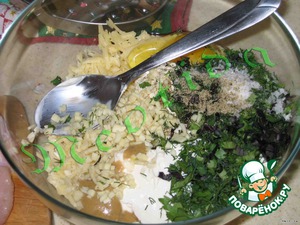 Сыр натереть на крупной терке, чеснок и зелень измельчить, добавить яйца, соль, перец, сметану и горчицу, все хорошо размешать.