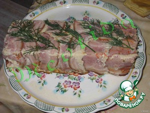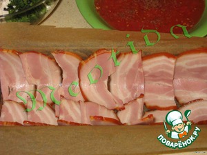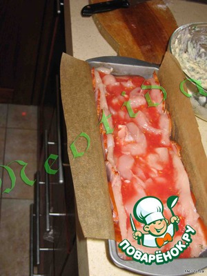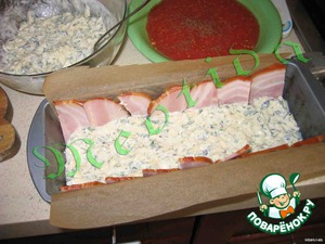 Бекон порезать тонкими полосками и выложить в форму, закрывая бока и дно (чуть-чуть внахлест). -