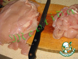 4 кусочка филе хорошо отбить в тонкие пластинки в кульке и посолить. Остальное филе нарезать крупными кусочками.