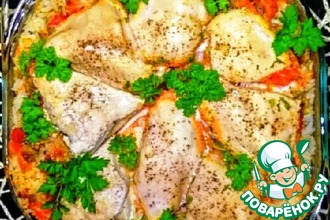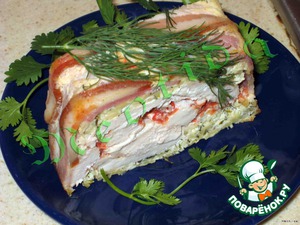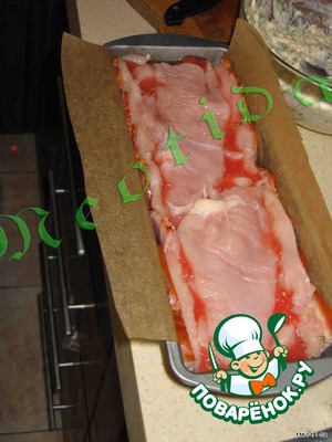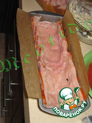 Закрыть дно и стенки пластинками из 3 отбитых кусочков филе.