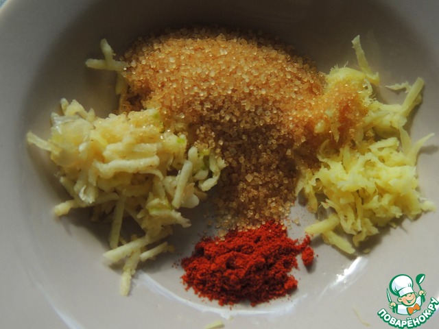 Натираем на мелкую тёрку зубчик чеснока и имбирь, такого же примерно размера.