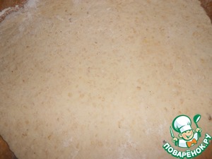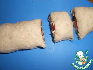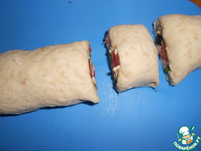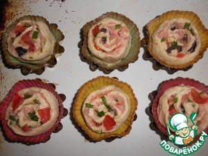 Сверните тесто в рулет. Нарежьте рулет на поперечные кусочки ( у меня получилось 9 кексов).