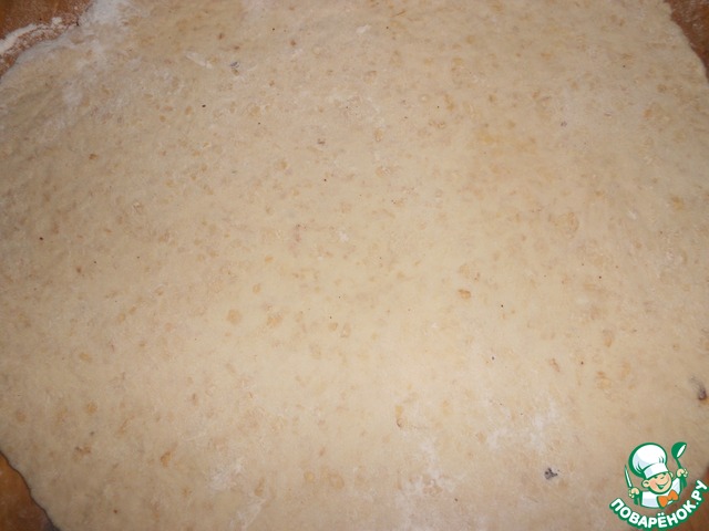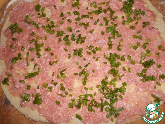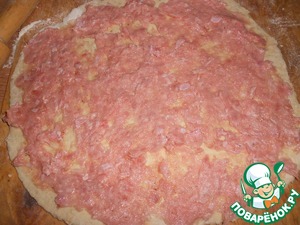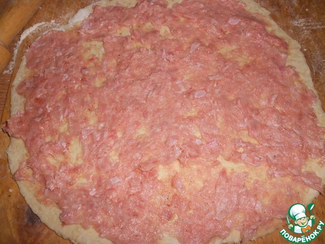 Фарш посолите, поперчите, перемешайте. На тесто выложите равномерно фарш.