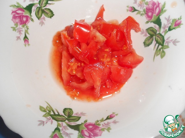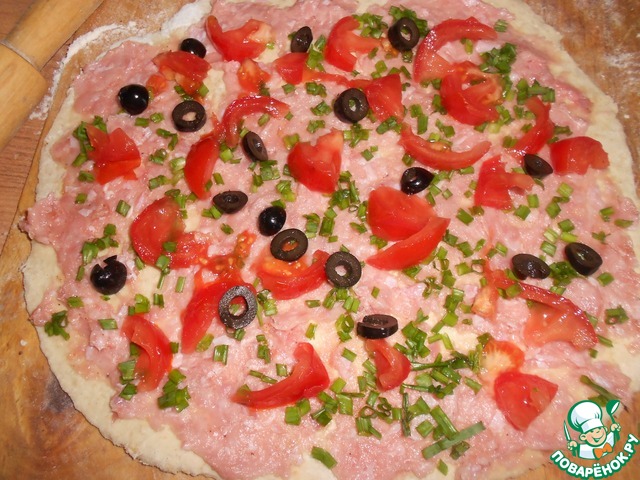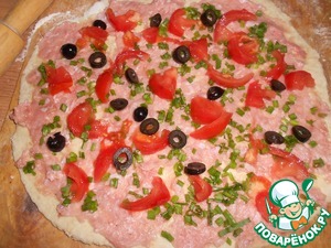 Выложите нарезанные маслины и помидор на слой фарша с луком.