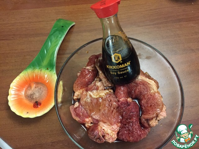 Мясо порезать на пластины толщиной 5 мм. Отбить, сложить в емкость и залить соевым соусом ТМ КИККОМАН- 4 ст. л.