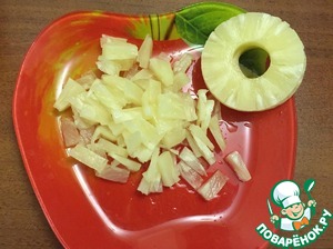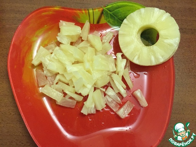 - Ананас (Консервированный, в шайбах( чтобы проще ориентироваться в пропорциях)) — 7 шт