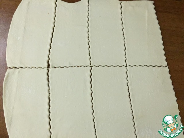 Слоёное тесто раскатываем до 3 мм толщиной, режем на 8 прямоугольников и отправляем в духовку 200 гр. на 15-20 мин.