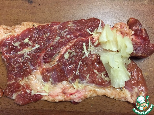 Достаем мясо, перчим, я не солила, т. к. соус соевый соленый. Посыпаем тертым чесноком, на одну сторону укладываем ананасы